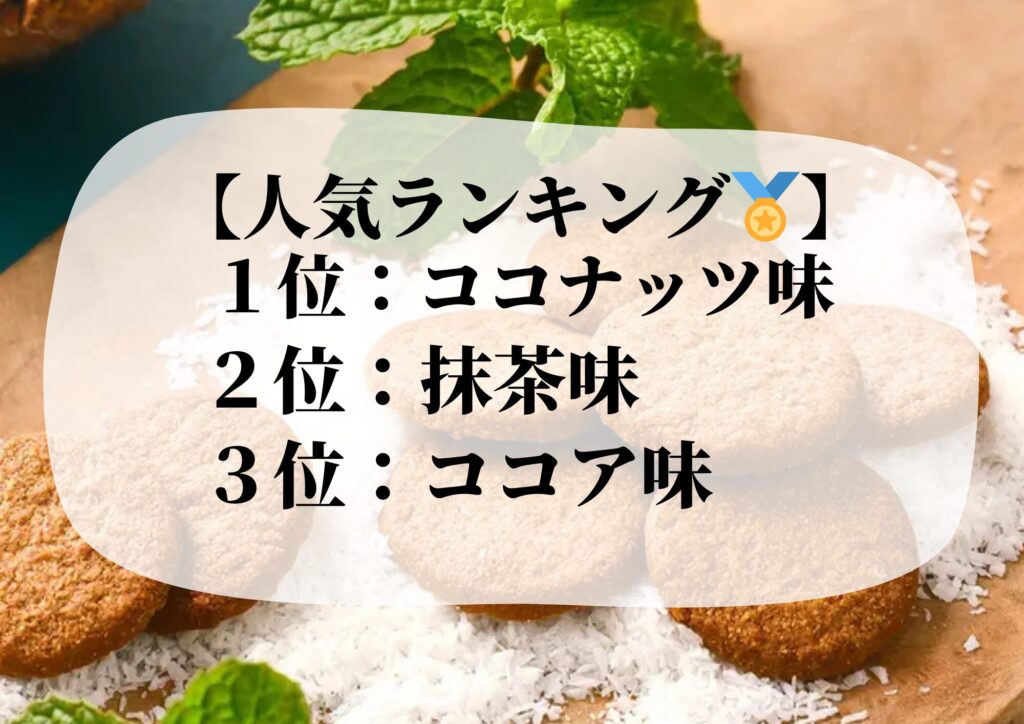 抹茶やココアと比べると香りがしっかりある分しっかり甘さを感じやすいため、甘い系のクッキーを食べたい方は、ココナッツかアールグレイがオススメです◎