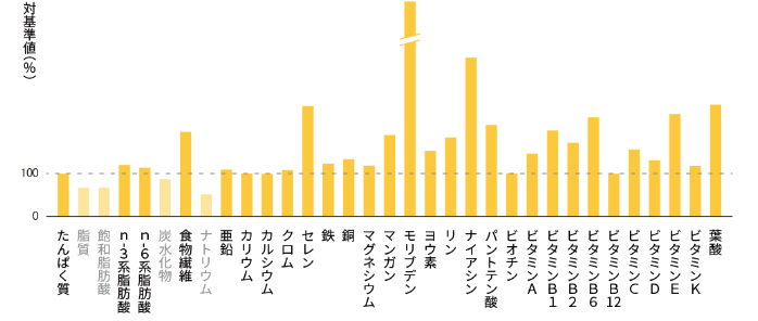 ※栄養素等表示基準値(18歳以上、基準熱量2,200kcal)に基づき、1日分の基準値1/3を100とした場合