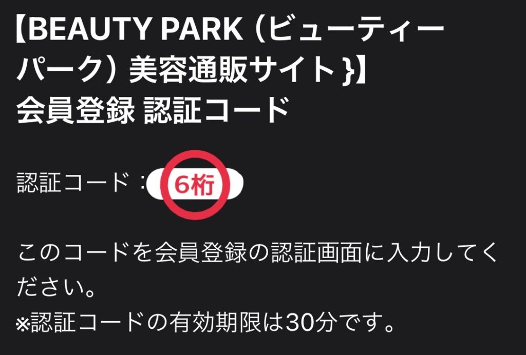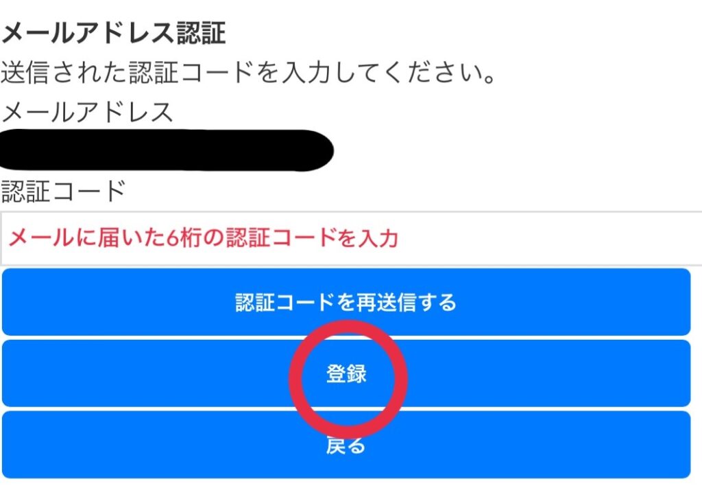 ④登録したメールアドレス宛に認証コード6桁が届くので、認証コード欄に入力する