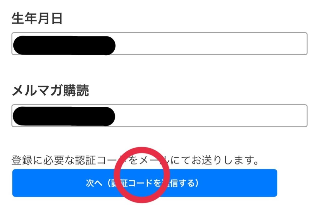 ③氏名・住所・電話番号・メールアドレス・生年月日を入力し『次へ(認証コードを送信する)』を押す